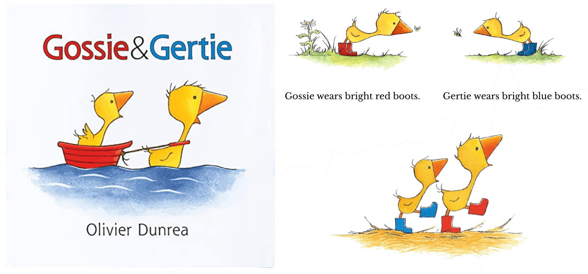 Source: Gossie & Gertie, written and illustrated by Olivier Dunrea (Clarion Books, 2002), cover and selected interior pages. Reduced-size excerpts reproduced here for review of how repeated visual cues support fast character recognition.