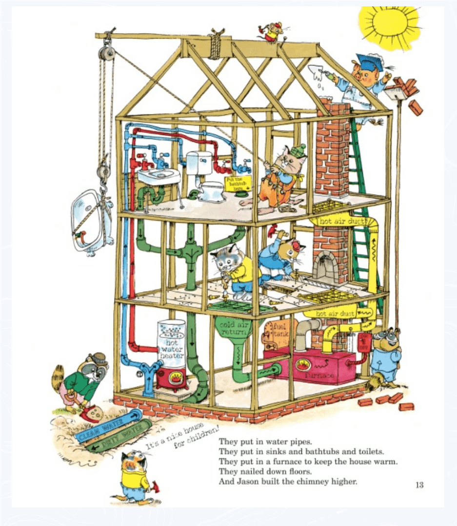 Children’s picture books take a completely different approach. Because of the audience and the word constraints, the images HAVE to carry much of the story and show how the pieces fit together. The words guide attention to what matters without trying to explain everything. When words and visuals work together that way, the reader can SEE how elements relate and the story stays consistent as it moves forward. This is an old one, but this illustration from Richard Scarry’s “What Do People Do All Day?” does a better job of explaining the various systems in a typical home than probably 90% of home improvement books.
