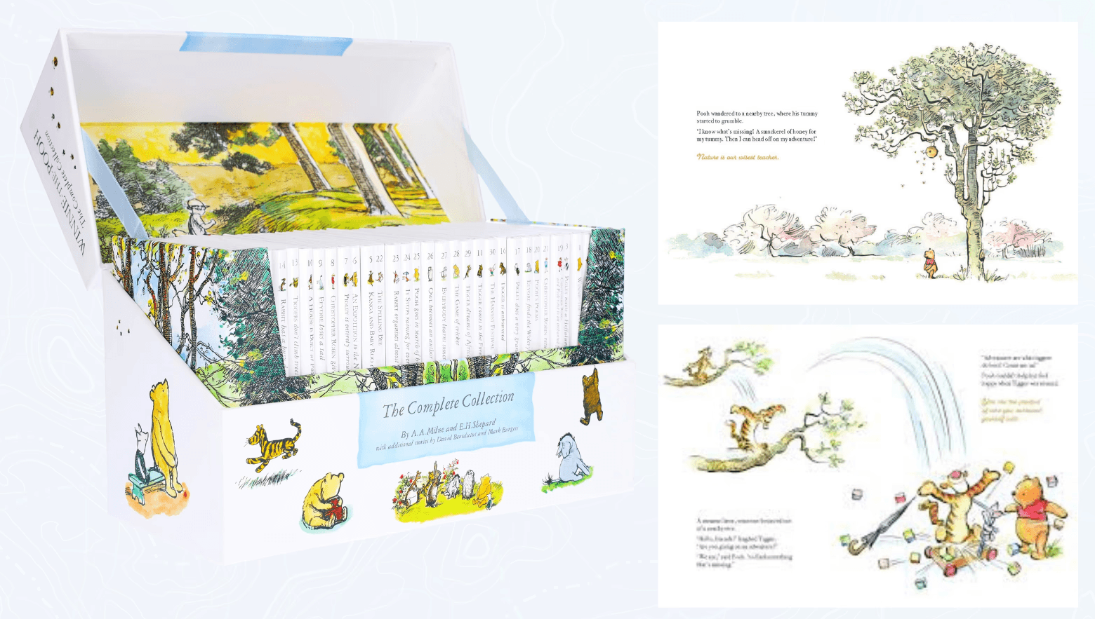 Source: Winnie-the-Pooh: The Complete Collection of Stories and Poems, by A. A. Milne, illustrated by E. H. Shepard (Egmont UK Ltd, 2001), slipcase and selected interior pages. Reduced-size excerpts reproduced here for review of how recurring characters and visual style create continuity across a series.
